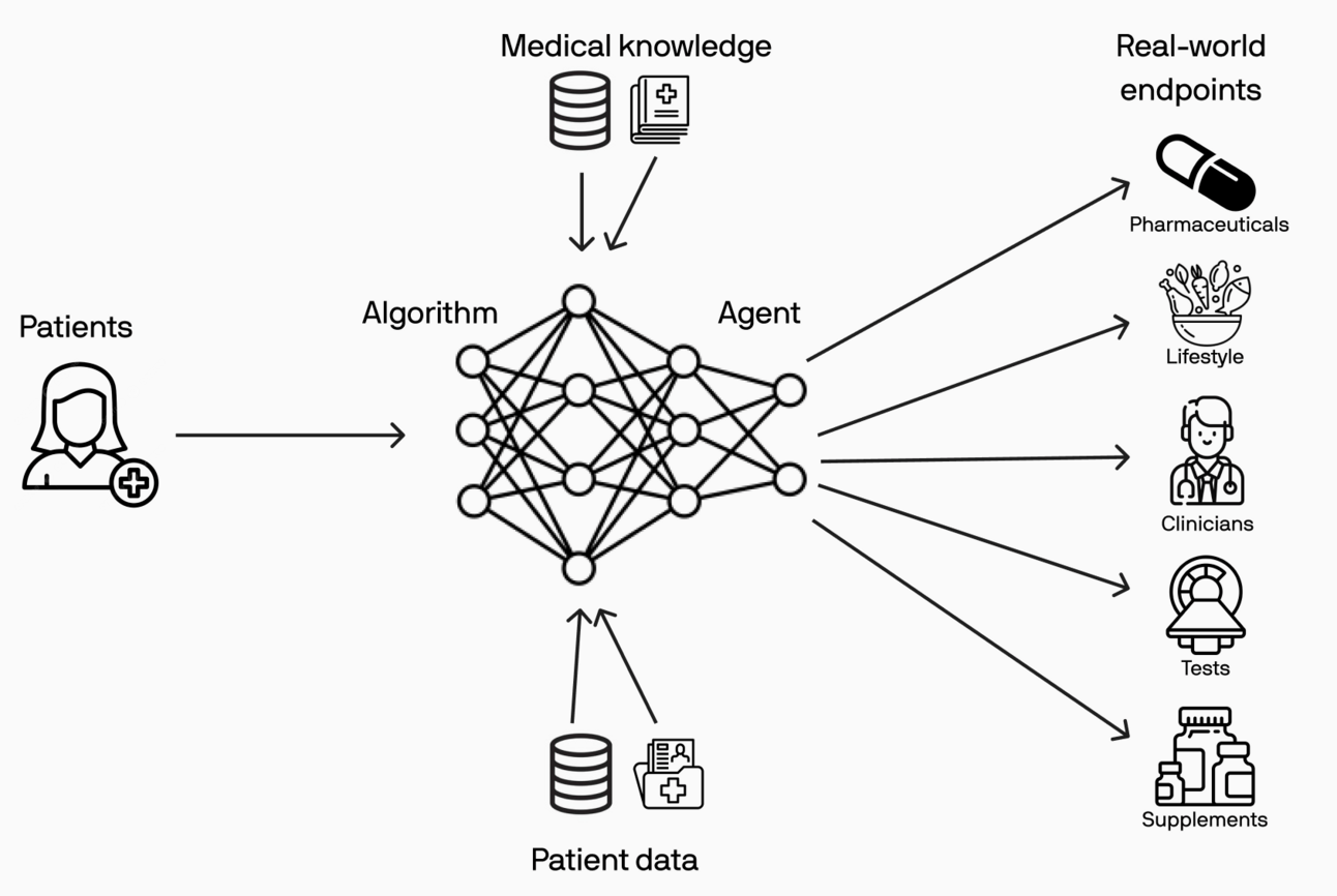 The algorithm, or agent, connects consumers to real-world endpoints (RX, supplements, diagnostic tests, allied health consults) to start actioning its recommendations